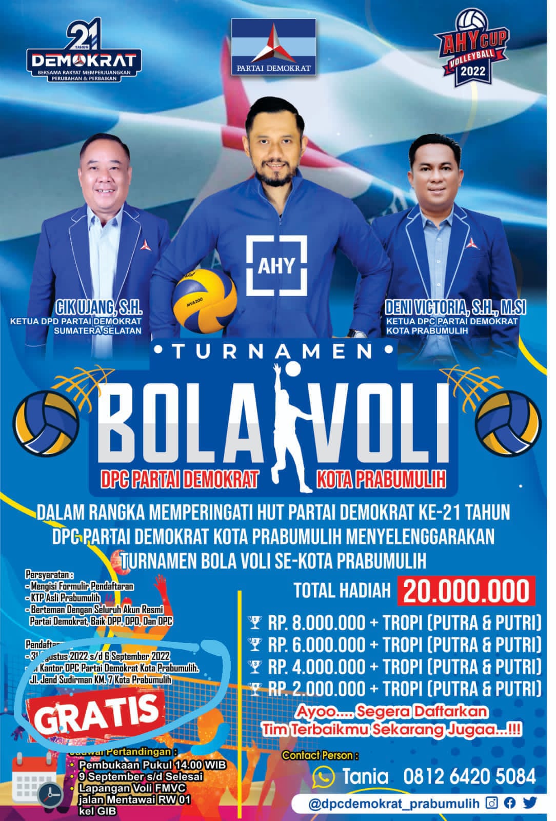 PRABUMULIH. Lembayungnews|• Demokrat Prabumulih, sebelumnya telah membuat pendaftaran peserta Turnamen Voly menyemarakkan HUT Demokrat ke 21 menargetkan sebanyak 64 peserta. Terdiri 32 putra dan 32 putri.