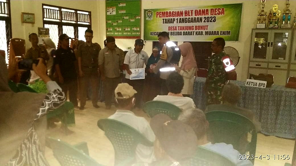 MUARA ENIM. Lembayungnews. Pemerintah Desa Tanjung Bunut Kecamatan Belida Darat, kabupaten Muara Enim Sumatera Selatan, bagikan Bantuan Langsung Tunai (BLT) dari anggaran Dana Desa (DD) untuk tahap 1, yakni bulan Januari, Februari dan Maret kepada 36 Keluarga Penerima Manfaat (KPM) Bertempat di kantor Kepala Desa Tanjung bunut, Senin (03/4/2023).