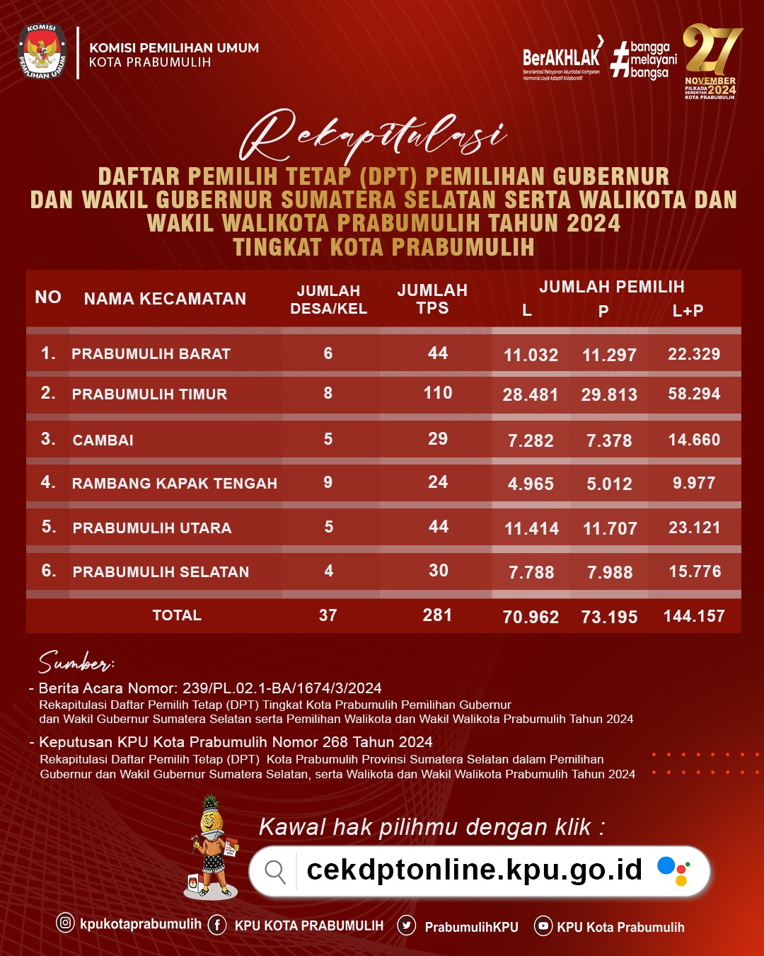 - Prabumulih Selatan : 30 TPS 15776 DPT